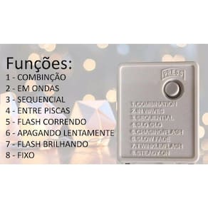 Modelo 8 funções: Possui 7 funções diferentes de pisca pisca, (Combinação, Em Ondas, Sequencial, Entre Piscas, flash Correndo, Apagando Lentamente, Flash Brilhando) mais uma função para FIXA, sem piscar. Esse modelo NÃO POSSUI conector macho e fêmea, para fazer emenda, ou seja, se comprar mais de uma unidade todas elas precisam ser ligadas separadamente em uma tomada ou extensão. Não é possível ligar uma na outra.