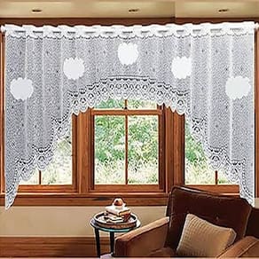 Tamanho: 1,00 x 0,40 x 3,00m (altura x altura centro x largura) Tecido: Renda com Estampa Categoria: 100% Poliéster Ambiente: Cozinha Ilhós: SEM Ilhós - Cortina Passa Varão Luminosidade: Permite luminosidade Sugestão: Varão tubular de 9 mm Lavagem: A mão com tecido macio e úmido e secagem à sombra Notas: Imagem ilustrativa | Também Vendido a Metro