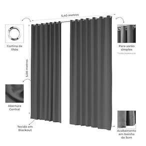 Características: Cortina longa para pé direito duplo Ideal para varão simples de 4m Tecido blackout (avesso todo preto) Não acompanha varão Detalhe de acabamento em ilhós Medida total de 5,40m de largura ESTICADA Cortina dividida 2 partes, ou seja, pode ser aberta ao meio Produto não é plástico (PVC), é tecido Cortina não é 100% Blackout, veda aproximadamente 70% Cada parte da cortina possui 2,70m ESTICADA Tecido Blackout Composição 100% Poliéster Marca: Paulo César