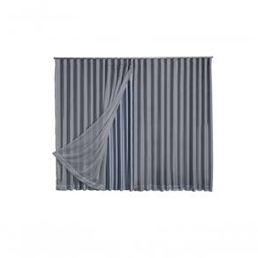 Dimensões: Largura total (Voil): 4.00m (dividido em 2 partes de 2.00m). Largura total (blackout): 2.00m (dividido em 2 partes de 1.00m). Altura: 2.70m. Acabamento: Trilho Suíço Max Duplo, com barra de 10cm. Instalação: