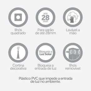 A cortina acompanha ilhós, o que facilita a sua instalação. Além disso, ela é muito fácil de lavar, bastando lavar a mão e secar à sombra. É importante ressaltar que essa cortina não deve ser utilizada com alvejantes a base de cloro, não deve ser colocada na secadora, não deve ser passada com ferro e não deve ser limpa a seco.