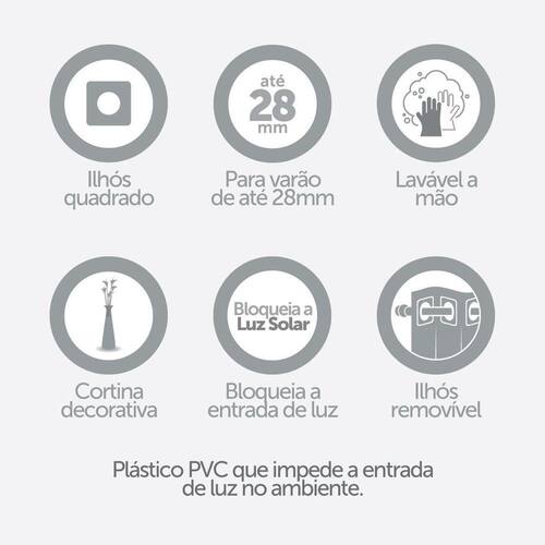 Principais vantagens: - Cortina corta luz 100%; - Tecido PVC resistente e durável; - Fácil de lavar e instalar; - Proporciona privacidade total; - Controle da luminosidade; - Acompanha ilhós.