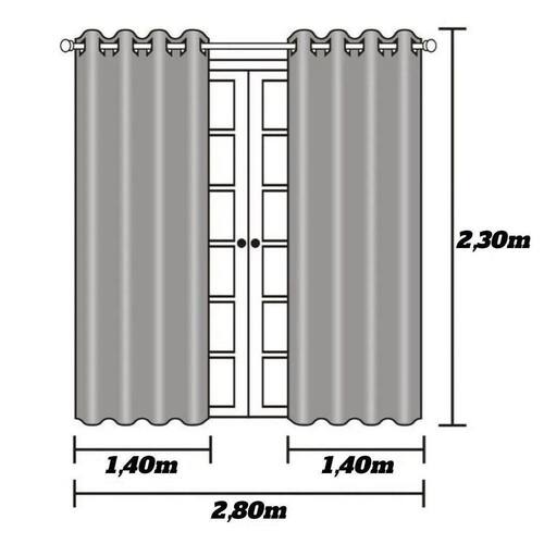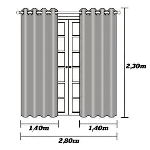 Contém: 01 Cortina 2,80 mts x 2,30 mts no total, sendo: 02 Partes de 1,40 mts x 2,30 mts com 16 ilhoses no total de 28 mm Indicada para varão simples de até 2,00 mts, é possível utilizar tanto o varão grosso 28 mm , quanto o fino 19 mm varão não incluso