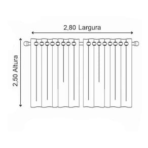 Contém: 01 cortina 2,50m altura x 2,80m largura no total, sendo: 02 partes de 2,50m altura x 1,40m largura com 16 ilhós brancos no total sendo 8 de cada lado Indicada para varão simples de até 2,00m
