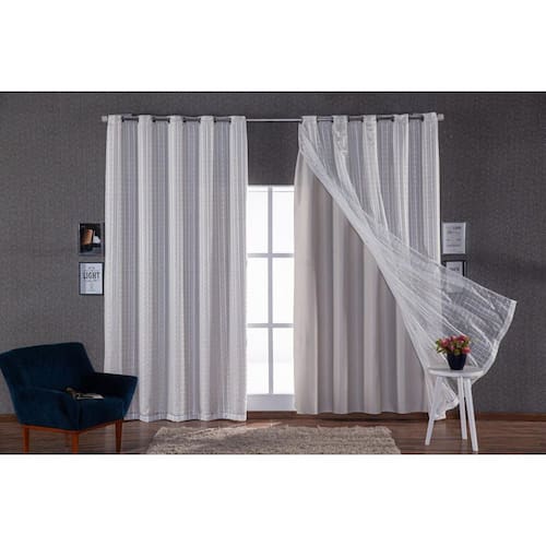 Cortina blecaute com voil sala quarto 4 metros Cor: palha com voil xadrez Cortina tecido blackout corta luz + voil 4 metros Medidas: 4 metros largura x 2,65 a 2,75 altura a altura varia de peça para peça de tecido A largura do tecido de 04 metros é com ela esticada, indicamos: Para varão de 3,00m a 3,50m Para varão simples 28mm - não acompanha varão