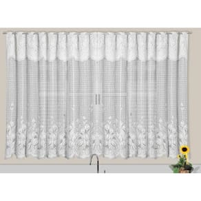 Feita em renda, a cortina possui um bandô com 0,30cm de altura, adicionando um toque de charme e requinte ao produto. A composição é 100% poliéster, garantindo durabilidade e resistência ao produto.