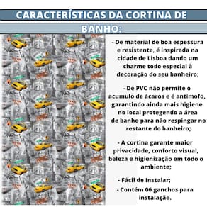 Cortina de box banheiro nova iorque com ganchos Contém:01 cortina para box estampada new york com ganchos. A cortina box de banheiro é a escolha ideal para quem busca praticidade e estilo na decoração do banheiro. Com sua durabilidade e facilidade de limpeza, ela é capaz de proteger o ambiente do excesso de água durante o banho, evitando a formação de mofo e outros problemas. Além disso, seu design moderno e elegante adiciona estilo ao seu banheiro, transformando-o em um ambiente mais aconchegante e agradável. Não perca mais tempo lidando com banheiros molhados e sem graça e adquira agora a sua cortina box de banheiro Características da cortina de banho: - de material de boa espessura e resistente, é inspirada na cidade de lisboa dando um charme todo especial à decoração do seu banheiro; - de pvc não permite o acumulo de ácaros e é antimofo, garantindo ainda mais higiene no local protegendo a área de banho para não respingar no restante do banheiro; - a cortina garante maior privacidade, conforto visual, beleza e higienização em todo o ambiente; - fácil de instalar; - contém 06 ganchos para instalação. Especificações: Material: pvc. Dimensões: larg: 1,38 m x alt: 1,98m. Peso: 0,400g aprox. Cor: estampada