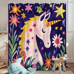 Tamanho da cortina de chuveiro: 180* 200 cm Peso: 410 g Material: poliéster Cor: unicórnio Embalagem: 1 x cortina de chuveiro Magical Unicorn & Floral Art — Apresenta um unicórnio sonhador cercado por flores e estrelas vibrantes, criando um ponto focal caprichoso e colorido perfeito para banheiros infantis ou decoração inspirada na fantasia. Tecido de poliéster durável — Feito de poliéster de alta qualidade que resiste a rugas e oferece um toque suave, preservando obras de arte brilhantes e detalhadas. Impermeável e de secagem rápida — Revestido para repelir a umidade e reduzir respingos, ajudando a manter um ambiente de banheiro seco e arrumado durante o uso diário. Fácil instalação com ganchos — Inclui 12 ganchos fortes compatíveis com a maioria dos varões de chuveiro padrão, garantindo uma configuração rápida e uma suspensão estável. Cuidados laváveis na máquina — Suporta uma lavagem suave na máquina para manter a cortina limpa e vibrante, prolongando sua vida útil geral.