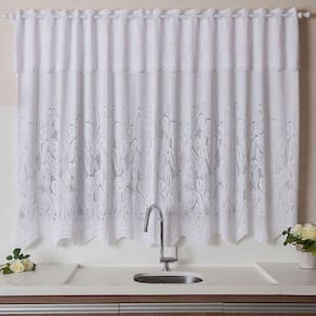 Cortina para Cozinha Interlar Renda Tulipinha Branca é uma cortina em estilo renda com uma linda estampa com tulipinhas para inspirar a sensação relaxante de estar em um jardim. Apresenta um bandô de 30 centímetros que incrementa um toque extra de requinte. Com um excelente acabamento e design sofisticado, essa cortina é garantia de chamar a atenção pela beleza e bom gosto. É confeccionada com um material sintético que garante uma maior durabilidade e praticidade.