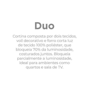 Requintada e cheia de charme, a cortina duo é composta por um voil decorativo no tecido bellini e um corta luz de tecido que controla a luminosidade sem bloqueá-la totalmente, apresentando sofisticação e beleza em seu lar, podendo utilizar em seu quarto, sala ou escritório. A cortina Duo tem o benefício de diminuir a temperatura dentro da sua residência, controle de acústico e privacidade para a sua família. O tecido e forro 100% poliéster propondo um estilo contemporâneo e com o toque liso, possui 2 partes de 2,20 m de largura por 2,80 m de altura com acabamento na bainha lateral e barra na parte inferior. Indicado para varão de 2,00 m com 28 ilhoses. Fotos ilustrativas, não acompanha o varão. Existem três grandes vantagens de comprar uma cortina pronta: