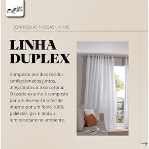 A Cortina Duplex Bellini é ideal para quem gosta de decorar ambientes com bom gosto, sofisticação, e que apreciam qualidade. Você pode utiliza-lá tanto em salas, como em quartos. Seu tecido é delicado e tem um caimento perfeito. Confeccionada com o Tecido Bellini Liso e Forro 100% Poliéster, dando um toque suave e agradável, essa combinação protege a cortina da luz e a torna mais durável. Sem dúvida uma ótima opção para quem gosta de ambientes neutros e tecidos mais leves.