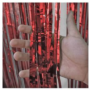 Essa cortina é composta por várias tiras longas e estreitas feitas de material metalizado vermelho, que brilham intensamente sob a luz. Cada tira tem um acabamento brilhante e refletivo, criando um efeito visual marcante quando a cortina é pendurada e se move com o fluxo de ar.