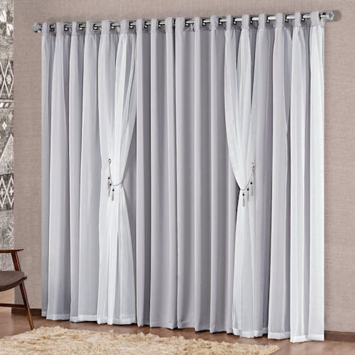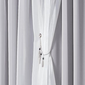 Cortina Mabelle, confeccionada no tecido voil e forro semi blackout que bloqueia até 50% da claridade, acompanha duas abraçadeiras (pingentes) em pedraria com imã.