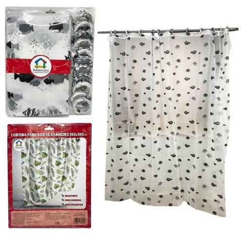 Contém na embalagem 01 cortina para box banheiro com ganchos 100% poliester 180cm