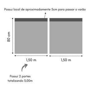 Medidas Prontas: Largura 3,00m x Altura 0,80cm Dividida em 2 partes de 1,50m x 0,80cm Tecido: Cetim Vison / 100% Poliéster Cor: Cinza Acabamento feito na Bainha em toda lateral Cortina possui local para passagem do Varão Não acompanha o Varão