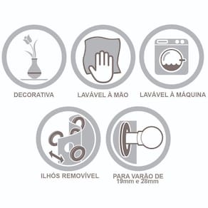 Contém: 01 Cortina 2,70 mts x 1,60 mts no total, sendo: 02 Partes de 1,350 mts x 1,60 mts com 16 ilhoses no total Indicada para varão de até 2,00 mts de 19 mm (fino) ou 28 mm ( grosso) (*Varão não incluso)