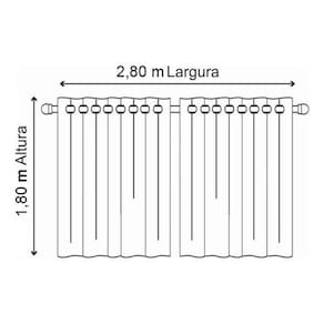 As cores das imagens pode ter o tom diferenciado de monitor pra monitor Cortina: paula A cortina é ideal para ser colocada na sala, quarto, local de trabalho, ou para ser aplicada em eventos em geral. Ela é produzida em tecido oxford 100% poliéster , material que confere mais beleza, durabilidade e maciez ao produto. Consumo de tecido: 3,00 metros x 1,80 metros Medidas prontas: largura 2,80 metros x altura 1,80 metros Quantidade de folhas: 2 folhas de 1,50 metros de largura x 1,80 metros altura Recomendável para varão simples de 2,00 metros a 2,50 metros com até 30 mm. Cor do ilhós: branco Cortina com ilhós para varão simples Não acompanha varão. Tecido: Oxford Composição: 100% poliéster Respondemos suas perguntas nos seguintes horários: Segunda à quinta: 07:00 as 17:00 Sexta: 07:00 as 16:00 Ean: 7909429775793 Marca: Não Informado