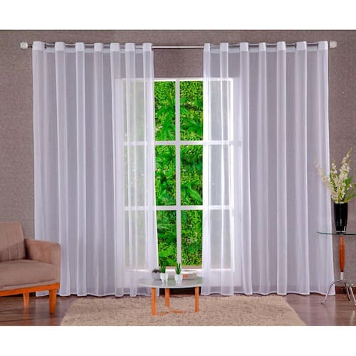 Linda Cortina para Sala ou Quarto Medidas Prontas: Largura 3,00m x Altura 2,80m Dividida em 2 partes de 1,50m x 2,80m Tecido: Voil liso / 100% Poliéster Cor: Branco Acabamento feito na Bainha Ilhós Cromado, indicado para Varão de 28mm Cortina ideal para Varão de até 2,0m Não acompanha o Varão Esta Cortina é de Voil, não forrada Cortina Transparente Marca: Lm Detona