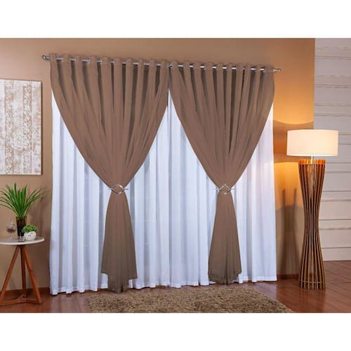Cortina Voil Com Forro Microfibra Sala E Quarto 6,00 X 2,00 Branco/Marrom A cortina voil com forro de microfibra combina perfeitamente com a decoração da sua sala, quarto ou escritórioAliando bom gosto, sofisticação e praticidade para um charme perfeito na decoração do ambiente.Contém na embalagem:01 cortina com forro 6,00m largura x 2,00m altura 02 fivelas decorativas cromadasIlhós redondo cromado em toda parte superior Composição: 100% poliéster Cortina em 2 partes de 3,00m x 2,00mForro em tecido microfibra e frente em voil. Importante:A cortina é dividida em duas partesSim em 2 partes.A cortina bloqueia 100% da luminosidadeNão, cortina não possui blackout, não fica transparente pois possui forro de microfibra.Fazem sob medidaSim fazemos sob medida , antes da compra solicite o orçamento.É para varão, simples ou duploVarão simples.Qual a cor é o ilhósIlhós cor cromado.Obs:varão vendido separadamenteIndicamos adquirir a cortina 2 metros maior que o seu varão para ficar franzida como na foto
