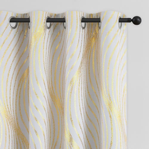 Atualize suas janelas com uma folha dourada em cortinas blecaute brancas 52 x 84. Capacidade 100% blackout: cada cortina é feita com 3 camadas de forro, incluindo um forro preto na parte de trás que bloqueia efetivamente 99%-100% da luz. Se você precisa tirar uma soneca durante o dia ou desfrutar de uma noite de cinema sem qualquer interferência de luz externa, essas cortinas proporcionam uma experiência completa de blecaute, ajudando você a relaxar e aproveitar seu tempo pessoal. O design de ponto de linha de onda matálico adiciona um toque de elegância e pode complementar vários estilos de interiores, do contemporâneo ao clássico. Estas cortinas para ambientes não são apenas sobre estilo e controle de luz, mas também sobre eficiência energética. O recurso de isolamento térmico ajuda a regular a temperatura em seu quarto, mantendo o calor fora durante o verão e mantendo o calor durante o inverno. O design de ilhós permite fácil instalação e deslizamento suave das cortinas. Os ilhós são feitos de metal durável, garantindo uso duradouro. Este design também adiciona um toque moderno à aparência geral das cortinas. O pacote inclui dois painéis, cada um medindo 213 cm de comprimento. Isso oferece ampla cobertura para a maioria das janelas padrão, garantindo que seu quarto esteja bem vestido e funcional. Uso versátil: embora essas cortinas sejam ideais para quartos e salas de estar, elas também podem ser usadas em outras áreas da sua casa, como cozinha, sala de jantar ou escritório em casa. Seu design versátil as torna adequadas para qualquer cômodo que exija controle de luz e estilo. O material de alta qualidade utilizado nessas cortinas não é apenas durável, mas também fácil de limpar. Basta lavar à máquina em água fria e secar em temperatura baixa para melhores resultados. O tecido grosso também oferece um grau de redução de ruído, ajudando a criar um ambiente mais silencioso e tranquilo. Estas cortinas ajudam a proteger seus móveis, pisos e obras de arte contra desbotamento, bloqueando os raios UV prejudiciais. - Pronto: cada painel mede 132 L x 214 C, com 2 painéis incluídos. A estampa de pontos dourados metálicos Xwincel em cortinas brancas traz elegância e um toque elegante a qualquer cômodo da sua casa - Brilho dourado metálico: a clássica estampa de pontos de onda dourada nas cortinas adiciona um toque moderno e bonito. Seja no quarto ou na sala de estar, estas cortinas complementam perfeitamente sua decoração - Blecaute eficaz: estas cortinas de 3 camadas com forro preto bloqueiam 100% da luz, equilibram as temperaturas internas e externas, reduzem o ruído e bloqueiam os raios UV. Ideal para home theater ou aqueles que precisam de um ambiente silencioso e escuro durante o dia - Parte superior com ilhós: cada painel de cortina possui 8 ilhós metálicos prateados com um diâmetro interno de 4 cm, ajustando-se à maioria das hastes para fácil instalação e deslizamento suave - Fácil de cuidar: permite lavar à máquina com água fria, secagem em baixa temperatura e passar a ferro em baixa temperatura, sem branqueamento