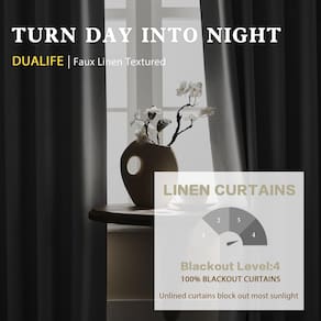 A Dualife como facilitadora é proteger sua qualidade de vida. "Dual" significa qualidade maravilhosa e cores modernas. Sweet Life com satisfação e felicidade. Linda textura de linho: trabalho trabalhado com textura de linho luxuosa, adicione vida casual e aconchegante à sua casa. As cortinas blackout DUALIFEsem luz são criadas com um material de estilo de linho texturizado macio para um visual lindo. Estas cortinas de linho grossas são versáteis, seja qual for o estilo moderno de casa de fazenda ou decoração tradicional. Amplamente utilizado para quarto, sala de estar, pátio, quarto de berçário, casa de fazenda, divisor de quarto, sala de jantar, porta deslizante, lavanderia. Cortinas blackout de linho são mais duráveis, suavidade, rugas . Lavável na máquina. 2 painéis cada pacote, largura da cortina 86 cm 127 cm, 182 cm, 213 cm, três comprimentos 137 cm, 160 cm, 182 cm, 203 cm, 213 cm, 228 cm, 243 cm, 243 cm, 243 cm, 276 cm, 270 cm, 270 cm, 270 4,3 cm. 304,8 cm, 335,3 cm Você pode pendurar suas cortinas pretas com 4 métodos. Uso amplo para sua maneira de pendurar preferida. (1) Use os laços traseiros para criar um efeito plissado elegante. (2) Um estilo clássico de bolso de haste, design de bolso para haste cria pregas facilmente, adicionando estilo decorativo. passando o bolso da haste de 8,4 cm. (3) Usando seu próprio anel de clipe (4) Usando pequenos ganchos no cinto de gancho e fixando em seus próprios anéis. (Anéis e ganchos não estão incluídos). Então você terá um estilo elegante de cortinas de janela plissadas. Temos diferentes cores e tamanhos para atender ao seu estilo. Pode bloquear 100% da luz solar brilhante e dos raios UV, virar de dia para noite, desfrutar do seu doce sono e proteger seus móveis do desbotamento da cor, proporcionando privacidade em sua adorável casa. - Informações básicas: conjunto de 2 painéis de linho blackout por pacote. Possui estilos de pendurar com aba traseira e bolso para haste para um estilo versátil. A parte superior das cortinas blackout de linho sintético com bolso de 7,6 cm e com seus próprios clip-rings, ganchos de chuveiro, ganchos de pino e ganchos de pregas. Meça a largura e a altura da sua janela com antecedência para obter o efeito decorativo e funcional desejado. Nossas cortinas são puramente feitas à mão. feito, pode haver 2,5 a 7,6 cm de erro no tamanho. - MATERIAL INOVADO: nossas cortinas blackout de linho são feitas de um tecido de mistura de linho, as cortinas são feitas de tecido de trama tripla, frente e traseira são um material de cor homocromática. (Exceto branca) A camada intermediária é preta, o que pode bloquear 100% do sol para que a cor do objeto pareça um pouco escura. Nossas cortinas blackout drapejam bem. As cortinas resistentes com isolamento térmico mantêm o calor dentro de casa no inverno e descarregam o calor no verão equilibram a temperatura ambiente. - Blackout total: cortinas térmicas para quartos podem efetivamente reduzir o impacto do ruído e proporcionar um ambiente de vida de qualidade silencioso e confortável. E também mantêm completamente fora da luz solar e dos raios UV. Oferece uma barreira isolada contra o calor do verão e o frio do inverno para equilibrar a temperatura ambiente e economizar energia. É adequado para quarto, sala de estar, pátio, portas deslizantes, teatros, conjunto. O comprimento longo oferece ampla cobertura, tornando-as ideais para janelas maiores ou tetos altos. - Versátil e adaptável: o tecido rico de linho misturado com poliéster apresenta um tom de linho neutro, efeito primitivo e natural torna os painéis mais drapeados e estéticos. Sensação de toque macio premium nessas elegantes cortinas de mistura de linho, adicionam um charme refrescante à sua janela. A textura de cor lisa e casual é perfeita para uma casa de fazenda rústica moderna, country chique, rústico ou estilo clássico tradicional. - Fácil de cuidar: lavável na máquina em água fria, use apenas alvejante sem cloro quando necessário, secar em temperatura baixa e passar a ferro quente conforme necessário.