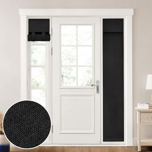 HOMEIDEAS Cortinas de luz lateral blackout 100% linho para porta da frente, cortinas de janela de porta lateral, persianas de porta para janelas pequenas, cobertura de porta com isolamento térmico, (1 painel, L30 x C68, preto) - 100% cortinas blackout: cortinas de porta de linho HOMEIDEAS com a mesma cor e textura em ambos os lados sem revestimento na parte de trás. O tecido ecológico texturizado de linho de dupla face pode bloquear 100% da luz solar e dos raios UV e proporcionar um bom ambiente para dormir durante o dia. - Fácil de pendurar: o pacote inclui 1 painel de cortina de porta e 1 fita adesiva. Pode ser facilmente instalada sem ferramentas ou hastes de cortina. Basta seguir nossa imagem de instruções para instalar, colocar a fita adesiva no vidro e unir firmemente o local de colagem nos painéis da cortina da porta. - CORTINAS ELEGANTES: as cortinas de porta da Homeideas combinam perfeitamente com a sua porta francesa. Estas cortinas blackout têm textura de linho, macias, resistentes a rugas, grossas, agradáveis ao toque e livres de cheiro químico. Pode proporcionar a você um bom ambiente privado. - e tamanhos: muitas cores e tamanhos diferentes para sua escolha. Atende a várias necessidades e propósitos de diferentes pessoas. Estas cortinas de porta de linho blackout podem se misturar facilmente com seu quarto, sala de estar, sala de jantar, lavanderia, cozinha ou qualquer cômodo da sua casa. Peça mais se precisar de mais. - Fácil de cuidar: lavar à máquina a frio, ciclo delicado com detergente suave. Não usar alvejante. Secar em temperatura baixa. Estas cortinas de porta não desbotam facilmente. Arrefecer o ferro se necessário para remover possíveis rugas da embalagem.