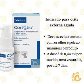 O Cortotic é um spray para os ouvidos de cães, contendo 0,584 mg/ml de Aceponato de Hidrocortisona. Indicado para otite externa aguda, possui contraindicações em casos de hipersensibilidade e lesões ulcerativas. Advertências incluem a precaução com a membrana timpânica e a idade/peso dos cães. Deve-se evitar contato com os olhos e pele ao manusear o produto, além de precauções contra ingestão acidental. Seu uso durante gestação e lactação não foi estabelecido. A dose é de 0,44 ml por ouvido, uma vez ao dia, por até 7 dias. Possíveis eventos adversos são raros.
