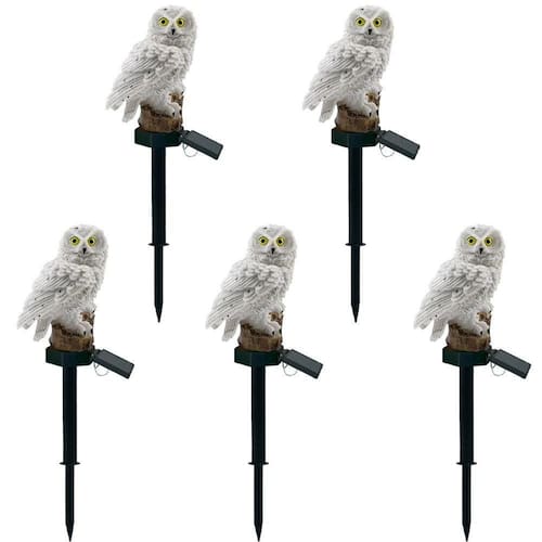 A coruja vem com uma estaca que ajuda a posicioná-la no solo ou onde preferir.
