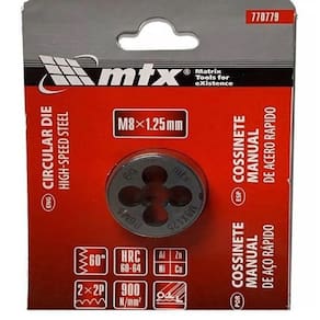 Cossinete redondo fechado indicado para confecção de roscas externas, parafs, eixos e tubos em metais não ferrosos.- Resistência aumentada ao desgaste.- Cossinete Avulso Redondo de Aço P6M5.- Marca: MTX- Dimensão: M8 x 1.25mm- Classe de precisão internacional e 6g.- Modelo: M8 770759.- 900 N/MM.- Dureza: 60-64 HRC.- Feito em aço de corte rápido P6M5.- Classe de precisão segundo o padrão internacional e 6g,- Resistência aumentada ao desgaste.- Cone de entrada de dois lados que aumenta a vida útil da ferramenta.