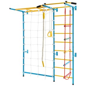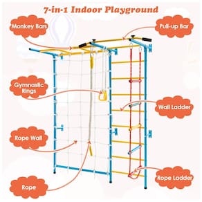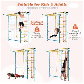 Brinque com mais segurança com materiais de aço carbono! A estrutura e os acessórios são feitos de material de aço carbono resistente, garantindo alta estabilidade e longa durabilidade. As extremidades da barra de pullup são cobertas com espuma EVA para evitar escorregões e aumentar o atrito. Os tubos inferiores possuem protetores de PVC para proteger o piso de arranhões. Este conjunto de parede 7 em 1 para diversão em família é fornecido com escada de parede, corda, barras de macaco, barra de pullup, escada de corda, corda e argolas de ginástica. Ao escalar, balançar e se balançar, melhora a capacidade de movimentação rápida a pé e a flexibilidade física, equilíbrio e coordenação. Melhora o ritmo do movimento corporal. Capacidade de peso da barra de pullup e escada de parede 100 kg. Capacidade de peso dos outros equipamentos 50 kg. Por favor, instale dispositivo de proteção contra quedas durante o uso.