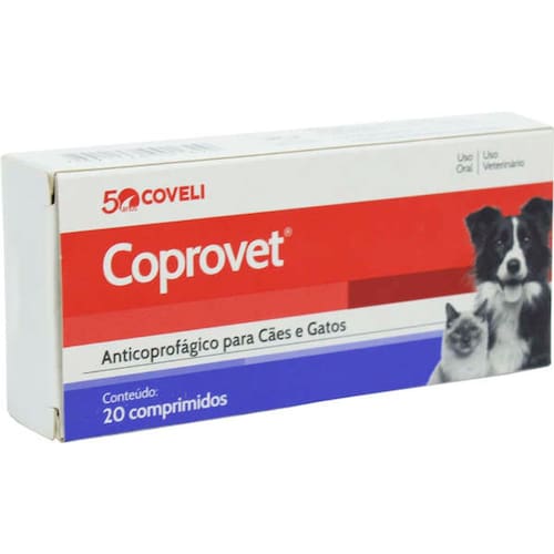 Anticoprofágico Coveli Coprovet para Cães e Gatos - 20 Comprimidos- Oferecer antes de cada refeição;- Não apresenta efeitos colaterais;- Age na causa (digestiva e/ou comportamental);- Contra coprofagia (ato de comer fezes);- Administrar simultaneamente em todos os animais (cães e gatos) que convivem com o animal que apresenta coprofagia;- Pode ser ministrado por tempo indeterminado em animais que apresentam com frequência deficiência de má absorção de proteína ou desvio comportamental.