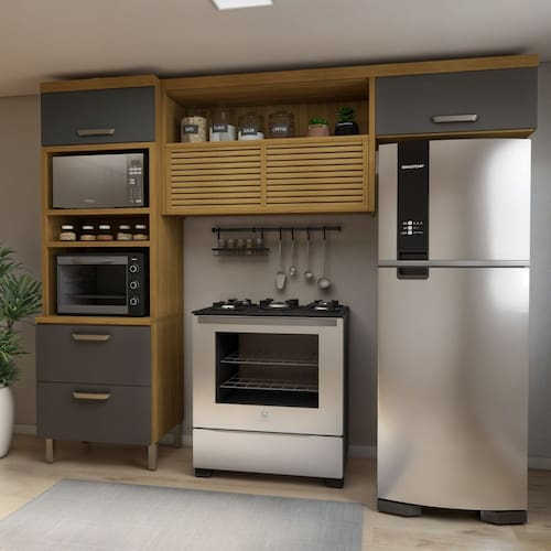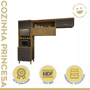 Transforme sua cozinha em um espaço de elegância e funcionalidade com nossas cozinhas moduladas em MDF. Combinando durabilidade e beleza, nossos móveis oferecem versatilidade para se adaptar ao seu estilo de vida. A qualidade do MDF garante resistência e fácil manutenção, enquanto o design modular permite a personalização do layout conforme suas necessidades. Torne sua cozinha o coração da casa, onde cada detalhe reflete sua personalidade única. Acabamento da Prateleira: Impressão Escala de Brilho da Prateleira: Fosco Acabamento da Gaveta: Impressão Escala de Brilho da Gaveta: Fosco Material do Puxador da Gaveta: ABS Acabamento da Porta: Impressão Escala de Brilho da Porta: Fosco Material do Puxador da Porta: ABS Acabamento dos Pés: Pintura Acompanha Tampo: Não Altura dos Pés: 13 cm Ambiente Principal: Cozinha Complexidade da Montagem: Alta: deve ser montado por um montador especializado Cor: Freijó/Grafite Cor do Produto: Freijó/Grafite Escala de Brilho: Fosco Gaveta com Chave: Não Itens Inclusos: 1 Cozinha e manual de montagem. Linha ou Coleção: Princesa Manual de Montagem e Instalação: https://product-hub-prd.madeiramadeira.com.br/912232/documents/e95c6407-558a-4aba-a80d-9f2fea447728010481COZINHA20PRINCESA203.pdf Material da Dobradiça/Corrediça da Porta: Metálica Material da Gaveta: MDF Material da Porta: MDF Material da Prateleira: MDF Material dos Pés: Polipropileno Medida de cada item (A x L x P): Paneleiro: 221cmx70cmx52cmArmário Aéreo: 76,4cmx200cmx32cm modular: Sim Montagem Flex: Não Necessita Montagem: Sim O Balcão Acompanha Pia: Não Origem do Produto: Nacional Pés Reguláveis: Sim Peso: 104 kg Peso Máximo por Gaveta: 5 kg Peso Máximo por Prateleira: 10 kg Possui Pés: 04 Possui Portas: Sim Possui Prateleiras: Sim Possui recorte para Cooktop: Não Possui Rodízio: Não Possui Vidro: Não Recomendações de Uso, Manutenção e Limpeza: Utilizar pano macio levemente umedecido e na sequencia pano macio seco. Sapatas Niveladoras: Sim Sistema de Montagem: Parafusos Tamanho Indicado do Tampo: . Tipo de Corrediça da Gaveta: Telescópica Tipo de Dobradiça da Porta: 35 mm Tipo de Puxador da Gaveta: Externo Tipo de Puxador da Porta: Externo