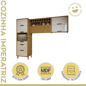 Transforme sua cozinha em um espaço de elegância e funcionalidade com nossas cozinhas moduladas em MDF. Combinando durabilidade e beleza, nossos móveis oferecem versatilidade para se adaptar ao seu estilo de vida. A qualidade do MDF garante resistência e fácil manutenção, enquanto o design modular permite a personalização do layout conforme suas necessidades. Torne sua cozinha o coração da casa, onde cada detalhe reflete sua personalidade única. Acabamento da Prateleira: Impressão Escala de Brilho da Prateleira: Fosco Acabamento da Gaveta: Impressão Escala de Brilho da Gaveta: Fosco Material do Puxador da Gaveta: Alumínio Acabamento da Porta: Impressão Escala de Brilho da Porta: Fosco Material do Puxador da Porta: Alumínio Acabamento dos Pés: Pintura Acompanha Tampo: Não Altura dos Pés: 13 cm Ambiente Principal: Cozinha Complexidade da Montagem: Alta: deve ser montado por um montador especializado Cor: Freijó/Off White Cor do Produto: Freijó/Off White Escala de Brilho: Fosco Gaveta com Chave: Não Itens Inclusos: 1 Cozinha e manual de montagem. Linha ou Coleção: Imperatriz Manual de Montagem e Instalação: https://product-hub-prd.madeiramadeira.com.br/912239/documents/69c2cd89-385b-4d33-a41b-1e9ebcfdc2ec2010476IMPERATRIZ201.pdf Material da Dobradiça/Corrediça da Porta: Metálica Material da Gaveta: MDF Material da Porta: MDF Material da Prateleira: MDF Material dos Pés: Polipropileno Medida de cada item (A x L x P): Paneleiro: 221cmx70cmx52cmArmário Aéreo 120cm: 78cmx120cmx32cm Armário Aéreo 80cm: 78cmx80cmx32cm modular: Sim Montagem Flex: Não Necessita Montagem: Sim O Balcão Acompanha Pia: Não Origem do Produto: Nacional Pés Reguláveis: Sim Peso: 129,3 kg Peso Máximo por Gaveta: 5 kg Peso Máximo por Prateleira: 10 kg Possui Pés: 04 Possui Portas: Sim Possui Prateleiras: Sim Possui recorte para Cooktop: Não Possui Rodízio: Não Possui Vidro: Não Recomendações de Uso, Manutenção e Limpeza: Utilizar pano macio levemente umedecido e na sequencia pano macio seco. Sapatas Niveladoras: Sim Sistema de Montagem: Parafusos Tamanho Indicado do Tampo: . Tipo de Corrediça da Gaveta: Telescópica Tipo de Dobradiça da Porta: 35 mm Tipo de Puxador da Gaveta: Externo Tipo de Puxador da Porta: Externo