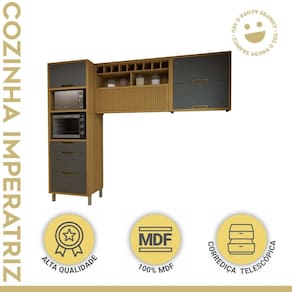 Transforme sua cozinha em um espaço de elegância e funcionalidade com nossas cozinhas moduladas em MDF. Combinando durabilidade e beleza, nossos móveis oferecem versatilidade para se adaptar ao seu estilo de vida. A qualidade do MDF garante resistência e fácil manutenção, enquanto o design modular permite a personalização do layout conforme suas necessidades. Torne sua cozinha o coração da casa, onde cada detalhe reflete sua personalidade única. Acabamento da Prateleira: Impressão Escala de Brilho da Prateleira: Fosco Acabamento da Gaveta: Impressão Escala de Brilho da Gaveta: Fosco Material do Puxador da Gaveta: Alumínio Acabamento da Porta: Impressão Escala de Brilho da Porta: Fosco Material do Puxador da Porta: Alumínio Acabamento dos Pés: Pintura Acompanha Tampo: Não Altura dos Pés: 13 cm Ambiente Principal: Cozinha Complexidade da Montagem: Alta: deve ser montado por um montador especializado Cor: Freijó/Grafite Cor do Produto: Freijó/Grafite Escala de Brilho: Fosco Gaveta com Chave: Não Itens Inclusos: 1 Cozinha e manual de montagem. Linha ou Coleção: Imperatriz Manual de Montagem e Instalação: https://product-hub-prd.madeiramadeira.com.br/912240/documents/ca353af7-d361-4eea-89e1-6edca39f6cd12010483IMPERATRIZ202.pdf Material da Dobradiça/Corrediça da Porta: Metálica Material da Gaveta: MDF Material da Porta: MDF Material da Prateleira: MDF Material dos Pés: Polipropileno Medida de cada item (A x L x P): Paneleiro: 221cmx70cmx52cmArmário Aéreo 120cm: 78cmx120cmx32cm Armário Aéreo 80cm: 78cmx80cmx32cm modular: Sim Montagem Flex: Não Necessita Montagem: Sim O Balcão Acompanha Pia: Não Origem do Produto: Nacional Pés Reguláveis: Sim Peso: 125,3 kg Peso Máximo por Gaveta: 5 kg Peso Máximo por Prateleira: 10 kg Possui Pés: 04 Possui Portas: Sim Possui Prateleiras: Sim Possui recorte para Cooktop: Não Possui Rodízio: Não Possui Vidro: Não Recomendações de Uso, Manutenção e Limpeza: Utilizar pano macio levemente umedecido e na sequencia pano macio seco. Sapatas Niveladoras: Sim Sistema de Montagem: Parafusos Tamanho Indicado do Tampo: . Tipo de Corrediça da Gaveta: Telescópica Tipo de Dobradiça da Porta: 35 mm Tipo de Puxador da Gaveta: Externo Tipo de Puxador da Porta: Externo