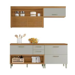 O armário aéreo de 2,00, foi projeto com uma porta articulada ripada, que traz aconchego, grande beleza e harmonia ao conjunto. Este mesmo armário possui montagem Flex, podendo o armário de geladeira/depurador ser posicionado a direita ou a esquerda na primeira montagem.