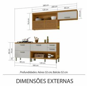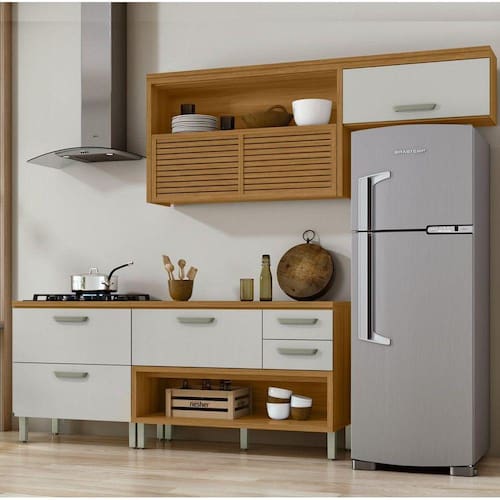 O armário aéreo de 2,00, foi projeto com uma porta articulada ripada, que traz aconchego, grande beleza e harmonia ao conjunto. Este mesmo armário possui montagem Flex, podendo o armário de geladeira/depurador ser posicionado a direita ou a esquerda na primeira montagem. Outro grande diferencial é o balcão com nicho que segue junto uma caixa organizadora. A caixa organizadora pode ser utilizada como uma fruteira com tudo arejado e a mão, e o nicho para guarda de utensílios mais utilizados no dia a dia, facilitando acesso e manutenção. Projetada para proporcionar praticidade e funcionalidade no uso diário, produzida com matérias prima e ferragens tecnológicas de última geração. Todo o projeto foi pensado para embelezar sua cozinha com muita praticidade no uso e muita qualidade e durabilidade no dia a dia.