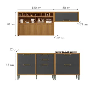 - Modernos puxadores embutidos em alumínio na cor champanhe, beleza, qualidade e durabilidade. Acabamento da Prateleira: Impressão Escala de Brilho da Prateleira: Fosco Acabamento da Gaveta: Impressão Escala de Brilho da Gaveta: Fosco Material do Puxador da Gaveta: Alumínio Acabamento da Porta: Impressão Escala de Brilho da Porta: Fosco Material do Puxador da Porta: Alumínio Acabamento dos Pés: Pintura Acompanha Tampo: Sim Altura dos Pés: 16 cm Ambiente Principal: Cozinha codigo_ean: 7909903388389 Complexidade da Montagem: Alta: deve ser montado por um montador especializado Cor: Freijó/Grafite Cor do Produto: Freijó/Grafite Escala de Brilho: Fosco Espessura do Tampo: 15 mm Gaveta com Chave: Não Itens Inclusos: 1 Cozinha Completa, 1 Kit Ferragens e 1 Manual de Montagem. Manual de Montagem e Instalação: https://product-hub-prd.madeiramadeira.com.br/865474/documents/7b641e3c-9e79-45d5-98ba-7716fb81d73dimperatriz4pCs500768500769.pdf Material da Dobradiça/Corrediça da Porta: Aço Material da Gaveta: MDF Material da Porta: MDF Material da Prateleira: MDF Material do Fundo: Chapa de Fibra Material do Tampo: MDF Material dos Pés: Polipropileno Medida de cada item (A x L x P): 1 Aereo 120cm: 78cm x 120cm x 52cm 1 Geladeira: 34cm x 80cm 32cm 1 Balcão 120cm: 86cm x 120cm x 52cm 1 Balcão 80cm: 86cm x 80cm x 52cm modular: Sim Necessita Montagem: Sim O Balcão Acompanha Pia: Não Origem do Produto: Nacional Pés Reguláveis: Sim Peso: 142,8 kg Peso Máximo por Gaveta: 5 kg Peso Máximo por Prateleira: 15 kg Possui Pés: 09 Possui Portas: Sim Possui Prateleiras: Sim Possui recorte para Cooktop: Não Possui Rodízio: Não Possui Vidro: Não Produto Montado: Sim Recomendações de Uso, Manutenção e Limpeza: Utilizar pano macio levemente umedecido e na sequencia pano macio seco. Sapatas Niveladoras: Sim Sistema de Montagem: Parafusos, cavilhas e Minifix. Tipo de Corrediça da Gaveta: Metálica Telescópica Tipo de Dobradiça da Porta: 35 mm Tipo de Puxador da Gaveta: Externo Tipo de Puxador da Porta: Externo Ean: 7909903388389