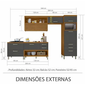 Diferenciais únicos: Modernas portas com abertura basculante e pistão a gás. Modernos puxadores de ABS beleza, qualidade e durabilidade. Corrediça Telescópica Abertura Integral: Robusta e com três estágios, esta corrediça é ideal para o uso diário, facilitando o acesso aos utensílios. Ergonômicos gavetões com laterais e traseiros altos para armazenagem com segurança de utensílios e mantimentos. Paneleiro com nicho para micro-ondas.