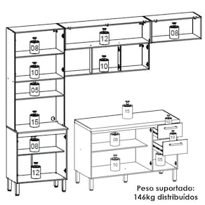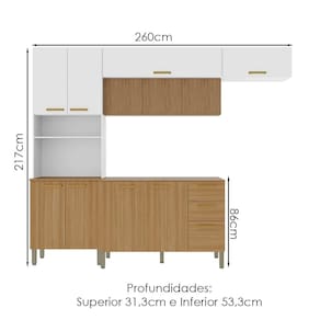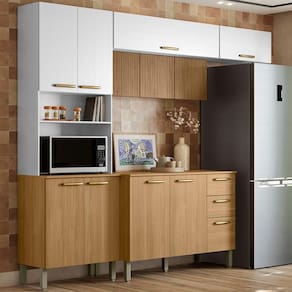 Cozinha e Balcão com tampo, design moderno que se adapta ao seu espaço! Produzida em MDP (12/15mm) com acabamento em pintura UV. Conta com 12 portas, sendo 02 basculantes e 03 com sistema de abertura passante (sem puxadores), 02 gavetas, suporte a gás, dobradiças e corrediças metálicas, nicho para microondas/forno, prateleiras internas e passa fio embutido. Os puxadores ergonômicos e pés reguláveis são em plástico resistente. Este produto será entregue em 05 volumes.