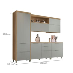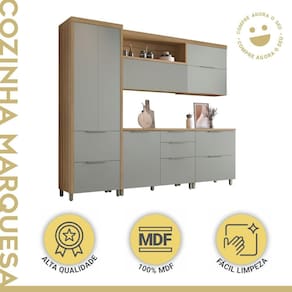 Inspirada em cozinhas planejadas, está disponível em módulos, permitindo composições variadas, projetos exclusivos, conforme o espaço e o gosto do consumidor. Acabamento da Prateleira: Pintura Escala de Brilho da Prateleira: Fosco Acabamento da Gaveta: Pintura Escala de Brilho da Gaveta: Fosco Material do Puxador da Gaveta: Alumínio Acabamento da Porta: Pintura Escala de Brilho da Porta: Fosco Material do Puxador da Porta: Alumínio Acabamento dos Pés: Pintura Acompanha Tampo: Sim Altura dos Pés: 10 cm Ambiente Principal: Cozinha codigo_ean: 7909903399736 Complexidade da Montagem: Alta: deve ser montado por um montador especializado Cor: Marrom/Verde Cor do Produto: Marrom/Verde Escala de Brilho: Fosco Gaveta com Chave: Não Itens Inclusos: 1 Cozinha completa, 1 Manual de Montagem e 1 Kit Ferragens. Manual de Montagem e Instalação: https://product-hub-prd.madeiramadeira.com.br/865745/documents/5799163e-cf14-41a9-a688-307d52e47ac5ha5pCsmarquesa500795500787.pdf Material da Dobradiça/Corrediça da Porta: Aço Material da Gaveta: MDF Material da Porta: MDF Material da Prateleira: MDF Material do Tampo: MDF Material dos Pés: Polipropileno Medida de cada item (A x L x P): 1 Paneleiro: 228cm x 70cm x 52cm 1 aereo 120cm: 82cm x 120cm x 32cm 1 Aereo 80cm: 82cm x 80cm x 42cm 1 Balcão 80cm: 91cm x 80cm x 52cm modular: Sim Necessita Montagem: Sim O Balcão Acompanha Pia: Não Origem do Produto: Nacional Pés Reguláveis: Sim Peso: 224,4 kg Peso Máximo por Gaveta: 5 kg Peso Máximo por Prateleira: 15 kg Possui Pés: 13 Possui Portas: Sim Possui Prateleiras: Sim Possui recorte para Cooktop: Não Possui Rodízio: Não Possui Vidro: Não Produto Montado: Sim Recomendações de Uso, Manutenção e Limpeza: Utilizar pano macio levemente umedecido e na sequencia pano macio seco. Sapatas Niveladoras: Sim Sistema de Montagem: Parafusos e Cavilhas Tipo de Corrediça da Gaveta: Metálica Telescópica Tipo de Dobradiça da Porta: 35 mm Tipo de Puxador da Gaveta: Externo Tipo de Puxador da Porta: Externo Ean: 7909903399736