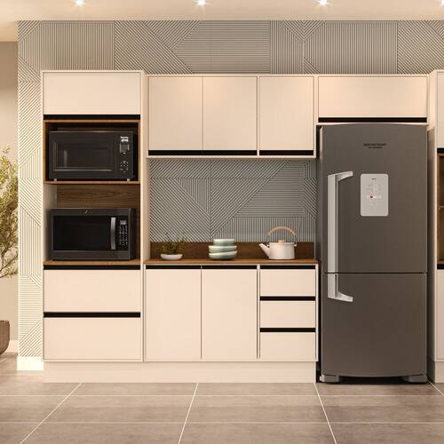 A cozinha 5 peças Koya da Politorno Móveis une sofisticação e funcionalidade para um ambiente bem organizado. Com 214 cm de altura, 306,8 cm de largura e 49 cm de profundidade, conta com um balcão de 3 gavetas e 2 portas, 2 armários aéreos, 1 armário aéreo basculante, 1 paneleiro e 1 torre quente, oferecendo amplo espaço para armazenar utensílios e eletrodomésticos. Suas corrediças telescópicas garantem abertura suave das gavetas, enquanto o acabamento em pintura UV proporciona resistência e durabilidade. Produzida com materiais de alta qualidade e design moderno, é uma escolha versátil e elegante. Para maior comodidade, o produto já acompanha tampo, oferecendo uma solução completa para sua cozinha. Possui rodapé.