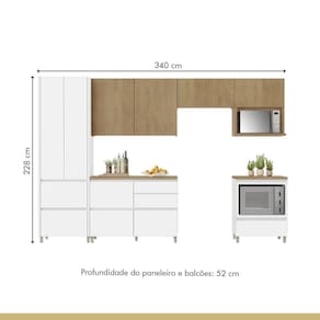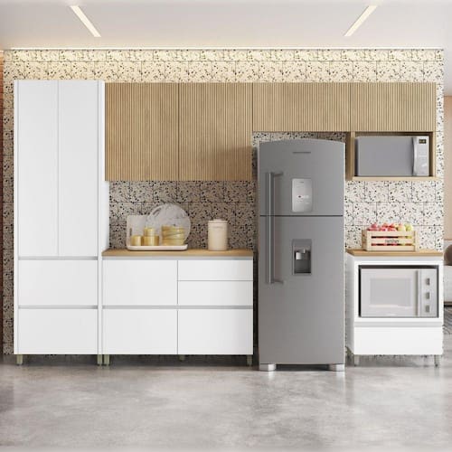 Os armários aéreos foram projetados com porta canelada, tendencia de Milão - Itália, que propõe sofisticação, aconchego, grande beleza e harmonia ao conjunto. Acabamento da Prateleira: Pintura Escala de Brilho da Prateleira: Fosco Acabamento da Gaveta: Pintura Escala de Brilho da Gaveta: Fosco Acabamento da Porta: Pintura Escala de Brilho da Porta: Fosco Acabamento dos Pés: Pintura Acompanha Tampo: Sim Altura dos Pés: 10 cm Ambiente Principal: Cozinha codigo_ean: 7909903399637 Complexidade da Montagem: Alta: deve ser montado por um montador especializado Cor: Branco/Marrom Cor do Produto: Branco/Marrom Escala de Brilho: Fosco Gaveta com Chave: Não Itens Inclusos: 1 Cozinha completa, 1 Manual de Montagem e 1 Kit Ferragens. Manual de Montagem e Instalação: https://product-hub-prd.madeiramadeira.com.br/865734/documents/aae74bac-746f-43d1-b233-abaddbdd10cfCsrainha500801500806500814.pdf Material da Dobradiça/Corrediça da Porta: Aço Material da Gaveta: MDF Material da Porta: MDF Material da Prateleira: MDF Material do Tampo: MDF Material dos Pés: Polipropileno Medida de cada item (A x L x P): 1 Paneleiro: 228cm x 70cm x 52cm 1 Aereo 120cm: 80cm x 120cm x 32cm 1 Aereo 80cm: 40cm x 80cm x 32cm 1 Aereo 70cm: 80cm x 70cm x 42cm 1 Balcão 120cm: 91cm x 120cm x 52cm 1 Balcão Forno: 91cm x 70cm x 52cm modular: Sim Necessita Montagem: Sim O Balcão Acompanha Pia: Não Origem do Produto: Nacional Pés Reguláveis: Sim Peso: 258,4 kg Peso Máximo por Gaveta: 5 kg Peso Máximo por Prateleira: 15 kg Possui Pés: 13 Possui Portas: Sim Possui Prateleiras: Sim Possui recorte para Cooktop: Não Possui Rodízio: Não Possui Vidro: Não Produto Montado: Sim Recomendações de Uso, Manutenção e Limpeza: Utilizar pano macio levemente umedecido e na sequencia pano macio seco. Sapatas Niveladoras: Sim Sistema de Montagem: Parafusos e Cavilhas Tipo de Corrediça da Gaveta: Metálica Telescópica Tipo de Dobradiça da Porta: 35 mm Tipo de Puxador da Gaveta: Embutido Tipo de Puxador da Porta: Embutido Ean: 7909903399637