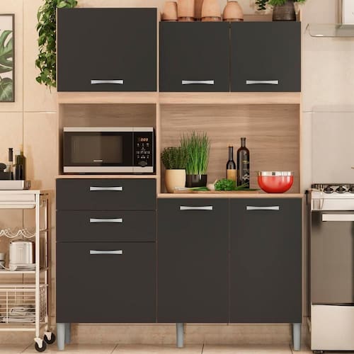 Cozinha Compacta Harmonia, com distribuição pensada para se ter o máximo de aproveitamento interno, estrutura em MDP de 15mm e 12mm, acabamento em pintura UV. Equipada com 06 portas articuladas com dobradiças metálicas, 02 gavetas com corrediças metálicas, puxadores em plástico na cor prata, conta com espaço para forno ou microondas, a parte interna conta com prateleiras e compartimentos muito bem divididos para você guardar alimentos, panelas, eletroportáteis, louças entre outros utensílios de forma organizada, tampo superior rebaixado garantindo mais espaço para organizar de forma decorativa, o visual moderno oferece sofisticação e bom gosto para a decoração da sua cozinha, acompanha pés plásticos redondos na cor cinza e um kit de ferragens de qualidade garantindo durabilidade e resistência ao móvel. Este móvel chegará em sua casa separado em 02 volumes.