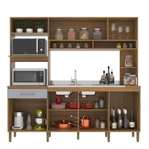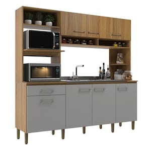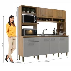 Dimensões: 200x207,8x51,5cm (AxLxP) | Altura: 200 cm | Largura: 207,8 cm | Profundidade: 51,5 cm | Peso: 100,1 kg | Acompanha pia: Não | Acompanha tampo: Não | Acabamento: Pintura UV | Espaço útil para forno: Superior 37,3x60x51,5cm (AxLxP) | Inferior 40x60x51,5 cm (AxLxP) | Cor Interna: Ipê | Tipo de porta: Bater | Altura dos pés: 17 cm | Material dos pés: Polipropileno | Tipo de dobradiça: Metálica | Tipo de corrediça: Metálica | Manutenção e limpeza: Utilize pano umedecido com água | Complexidade da montagem: Média: pode ser montado por mais de uma pessoa e|ou necessite de maior conhecimento para montagem | Material: MDP 15mm | Cor: Ipê|Cristalo | Quantidade de pés: 9 pés | Quantidade de portas: 7 portas | quantidade de gavetas: 1 gaveta | Material do puxador: ABS | Conteúdo da embalagem: 1 cozinha, kit ferragens e manual de montagem Cor: Ipê|Griseo