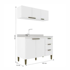 Cozinha 2 Peças Bia na cor Branco com suas medidas de 120 cm de comprimento 53 cm de profundidade e 193 cm de altura. Material em MPD 15 mm. A mesma é composta por 5 portas de bater e três gavetas. Suas dobradiças e corrediças são metálicas. Possui um espaço interno amplo. Seu balcão de pia possui uma prateleira que suporta até 7KG e aéreo com uma divisão vertical interna.