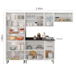 Estrutura: : : : : : : : : Em Aço carbono com acabamento em pintura eletrostáticaAcabamento: : : : : : : : : Pintura epóxiPortas: : : : : : : : : 14 portas sendo 03 portas com vidro temperados e com dobradiças metálicasGavetas: : : : : : : : : 03 gavetas com estrutura super-resistente e 100% em aço, com corrediças metálicasPuxadores: : : : : : : : : PVCPés: : : : : : : : : PVC na coloração grafite e com ajuste de alturaTampo Balcão: : : : : : : : : MDP 25 mmLargura Paneleiro Duplo: : : : : : : : : 70,0 cmAltura Paneleiro Duplo: : : : : : : : : 188,0 cmProfundidade Paneleiro Duplo: : : : : : : : : 28,3 cmLargura Armário Triplo com Vidro : : : : : : : : : 105,0 cmAltura Armário Triplo com Vidro: : : : : : : : : 52,5 cmProfundidade Armário Triplo com Vidro: : : : : : : : : 28,3 cmLargura Armário Duplo Geladeira: : : : : : : : : 70,0 cmAltura Armário Duplo Geladeira: : : : : : : : : 35,0 cmProfundidade Armário Duplo Geladeira: : : : : : : : : 28,3 cmLargura Balcão com 04 gavetas: : : : : : : : : 105,0 cmAltura Balcão com 04 gavetas: : : : : : : : : 85,3 cmProfundidade Balcão com 03 gavetas: : : : : : : : : 44,8 cmLargura total: : : : : : : : : 245,0 cmAltura total: : : : : : : : : 188,0 cmProfundidade balcão: : : : : : : : : 44,8 cmPeso total: : : : : : : : : 69,05 KgGarantia: : : : : : : : : 03 mesesInformações Sobre Montagem: : : : : : : : : Não possuímos serviço de montagem.