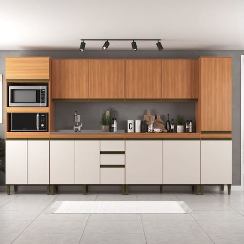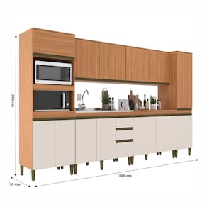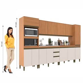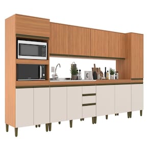 Medida total do produto 203 cm de altura 360 cm de largura e 52 cm de profundidade. Acabamento da Prateleira: Finish Foil Escala de Brilho da Prateleira: Fosco Acabamento da Gaveta: Finish Foil Escala de Brilho da Gaveta: Fosco Material do Puxador da Gaveta: Plástico Acabamento da Porta: Finish Foil Escala de Brilho da Porta: Fosco Material do Puxador da Porta: Plástico Acabamento dos Pés: Polipropileno Acompanha Rodapé Decorativo: Não Acompanha Tampo: Não Altura dos Pés: 17 cm Altura Máxima dos Pés: 17.0000 Ambiente Principal: Cozinha Balcão Suporta Pia: Sim codigo_ean: 7909903975190 Complexidade da Montagem: Média: pode ser montado por mais de uma pessoa e/ou necessite de maior conhecimento para montagem Cor: Freijó/Off White Cor do Produto: Freijó/Off White Cor Flex: Não Cor Interna: Freijó Escala de Brilho: Fosco Espessura do Material da Estrutura: 15 mm Gaveta com Chave: Não Itens Inclusos: 1 Cozinha completa e manual de montagem via QR Code impresso na embalagem e no Kit Ferragem Linha ou Coleção: 2025 Manual de Especificação Técnica: https://product-hub-prd.madeiramadeira.com.br/952652/documents/e7c836c7-2f9d-4123-80af-281bcebb344b2483018266217295356639638.pdf Manual de Montagem e Instalação: https://product-hub-prd.madeiramadeira.com.br/952652/documents/533aae0d-3205-4716-96be-2883accd863e2483015266217295354777327.pdf Marca: j carvalho Material da Dobradiça/Corrediça da Porta: Metálica Material da Gaveta: MDP Material da Porta: MDP Material da Prateleira: MDP Material do Fundo: T-HDF Material dos Pés: Polipropileno Medida de cada item (A x L x P): Balcão de pia : A 87 x C 120x P 52 - Aéreo: A 69,5 x C 120 x P 32 cm - Aéreo: A 69,5 x C 120 x P 32 cm - Torre: A 203 x C 70 x P 52 cm - Paneleiro A 203 x C 50 x P 52 cm - Balcão com tampo : A 87 x C 120x P 52 Montagem Flex: Não Necessita Montagem: Sim O Balcão Acompanha Pia: Não Origem do Produto: Nacional Pés Reguláveis: Sim Peso: 217,7 kg Peso Máximo por Gaveta: 5 kg Peso Máximo por Prateleira: 5 kg Possui Pés: 18 Possui Portas: Sim Possui Prateleiras: Sim Possui recorte para Cooktop: Não Possui Rodízio: Não Possui Vidro: Não Produto Montado: Sim Recomendações de Uso, Manutenção e Limpeza: flanela umedecida Sapatas Niveladoras: Não Sistema de Montagem: parafusos Tamanho Indicado da Pia: 120X53 Tamanho Indicado do Tampo: 120X53 Tipo de Corrediça da Gaveta: Simples Tipo de Dobradiça da Porta: Simples Tipo de Puxador da Gaveta: Externo Tipo de Puxador da Porta: Externo