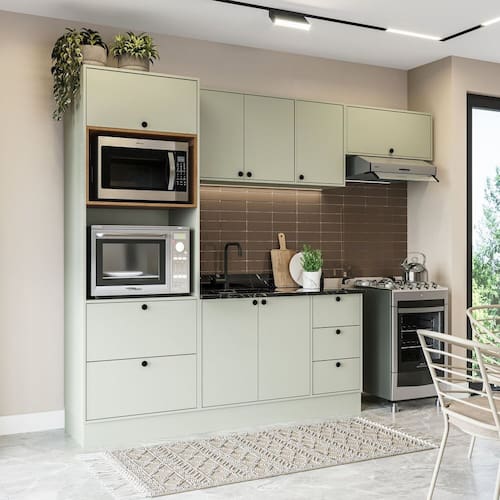 A Cozinha Rubi Yescasa é a escolha perfeita para quem busca sofisticação e praticidade no dia a dia. Com puxadores ponto que trazem um toque elegante e moderno, ela conta com acabamento em pintura UV, garantindo maior resistência, durabilidade e brilho às peças. Seu amplo espaço de 270 cm de largura, 214 cm de altura e 49 cm de profundidade oferece organização inteligente para todos os utensílios. O modelo ainda inclui torre quente, ideal para forno e micro-ondas, armário basculante, balccão com espaço para pia e conjunto de armários aéreos. Completa e funcional, essa cozinha une design, qualidade e praticidade para transformar o coração da sua casa. Acabamento da Prateleira: Pintura Escala de Brilho da Prateleira: Semi-Fosco Acabamento da Gaveta: Pintura Escala de Brilho da Gaveta: Semi-Fosco Material do Puxador da Gaveta: Plástico Acabamento da Porta: Pintura Texturizada UV Escala de Brilho da Porta: Semi-Fosco Acompanha Rodapé Decorativo: Sim Acompanha Tampo: Não Ambiente Principal: Cozinha Balcão Suporta Pia: Sim codigo_ean: 7900288237248 Complexidade da Montagem: Alta: deve ser montado por um montador especializado Cor: Verde Oliva Cor do Produto: Verde Oliva Cor Interna: Verde Oliva Escala de Brilho: Semi-Fosco Gaveta com Chave: Não Itens Inclusos: 1 Cozinha Completa, Kit Ferragens, Manual de Montagem e Termo de Garantia Linha ou Coleção: Rubi Manual de Montagem e Instalação: https://product-hub-prd.madeiramadeira.com.br/615163961/documents/659e144d-cc8a-44a1-a842-1e39bd2a5c583202328622417579405373622.pdf Marca: Yescasa Material da Corrediça: Metálica Material da Dobradiça/Corrediça da Porta: Metálica Material da Gaveta: MDP Material da Porta: MDP Material da Prateleira: MDP Material dos Pés: MDP Medida de cada item (A x L x P): Balcão 3 gavetas (81cm x 120cm x 49cm); Aéreo 3 portas (59cm x 120cm x 29cm); Aéreo Basculante (35,7cm x 80cm x 29cm); Torre quente (214cm x 70cm x 49cm) modular: Sim Necessita Montagem: Sim O Balcão Acompanha Pia: Não Origem do Produto: Nacional Pés Reguláveis: Não Peso: 106,76 kg Peso Máximo por Gaveta: 5 kg Peso Máximo por Prateleira: 5 kg Possui Pés: Rodapé Possui Portas: Sim Possui Prateleiras: Sim Possui recorte para Cooktop: Não Possui Rodízio: Não Possui Vidro: Não Produto Montado: Sim Recomendações de Uso, Manutenção e Limpeza: Utilize um pano macio umedecido com água e sabão neutro, seguido de pano seco. Não utilize produtos químicos ou abrasivos para limpeza, pois estes danificam o revestimento do móvel. Sapatas Niveladoras: Não Sistema de Montagem: Cavilha, Parafuso, Minifix e prego. Acompanha bucha e parafuso para fixação na parede Suporta Até (kg): 30 kg Tamanho Indicado da Pia: 120x49 Tamanho Indicado do Tampo: 120x49 Tipo de Corrediça da Gaveta: Metálica Telescópica Tipo de Dobradiça da Porta: Simples Tipo de Dobradiça/Corrediça da Porta: Simples Tipo de Puxador da Gaveta: Externo Tipo de Puxador da Porta: Externo
