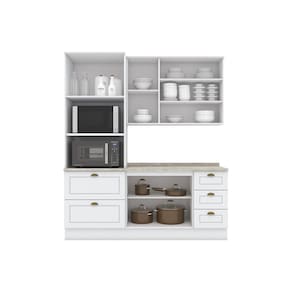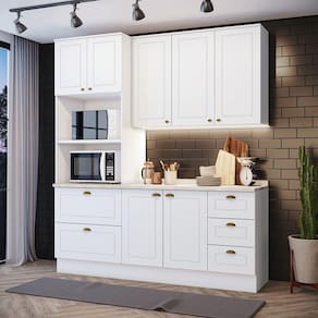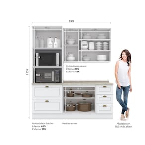 FICHA TÉCNICA: Cor Interna: Trama Branco Acabamento: Pintura UV Texturizada Escala de Brilho: Fosco Material do Fundo: MDF Material Principal: MDF Qtd. Gavetas: 5 Und Peso Máximo por Gaveta: 3 Kg Material do Puxador Gaveta: Alumínio Material da Corrediça: Metálica Telescópica Material da Gaveta: MDF Qtd. Portas: 7 Und Material da Dobradiça: Metálica em 35mm com fechamento suave (Amortecimento). Material do Puxador Porta: Metal Zamac Tipo Porta: Bater Qtd. Prateleiras: 5 Und Peso Máximo por Prateleira: 8 Kg Material da Prateleira: MDF Qtd. Pés: Possui rodapé Material Pés: MDF Altura Pés/Rodapés: 14,5 Cm Balcão Acompanha Pia: Não Tamanho Indicado da Pia: 120cm x 52cm Acompanha Tampo: Sim Material do Tampo: BP MDP Produto Suporte até (Kg): 105 Kg Medidas Conjunto Montado (AxLxP): 220,5 x 191,5 x 51 Cm Peso Conjunto Montado: 150 Kg