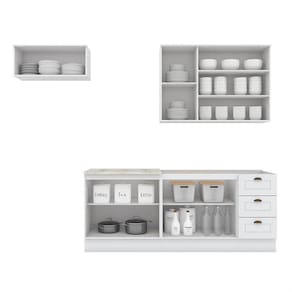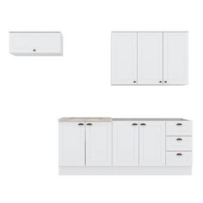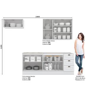 FICHA TÉCNICA: Cor Interna: Trama Branco Acabamento: Pintura UV Texturizada Escala de Brilho: Fosco Material do Fundo: MDF Material Principal: MDF Qtd. Gavetas: 03 Und Peso Máximo por Gaveta: 3 Kg Material do Puxador Gaveta: Alumínio Material da Corrediça: Metálica Telescópica Material da Gaveta: MDF Qtd. Portas: 8 Und Material da Dobradiça: Metálica em 35mm com fechamento suave (Amortecimento). Material do Puxador Porta: Metal Zamac Tipo Porta: Bater e Basculante Qtd. Prateleiras: 4 Und Peso Máximo por Prateleira: 8 Kg Material da Prateleira: MDF Qtd. Pés: Possui rodapé Altura Pés/Rodapés: 14,5 Cm Balcão Acompanha Pia: Não Tamanho Indicado da Pia: 120cm x 52cm Acompanha Tampo: Apenas para Cooktop Material do Tampo: BP MDP Produto Suporta até (Kg): 105 Kg Possui balcão para Forno de Embutir: não Tampo possui recorte p/Cooktop: Sim Medida Recorte p/Cooktop: 2,5 x 80 x 53,5 Cm Medidas Conjunto Montado (AxLxP): 220,5 x 280 x 53,3 Cm Peso Conjunto Montado: 114 Kg